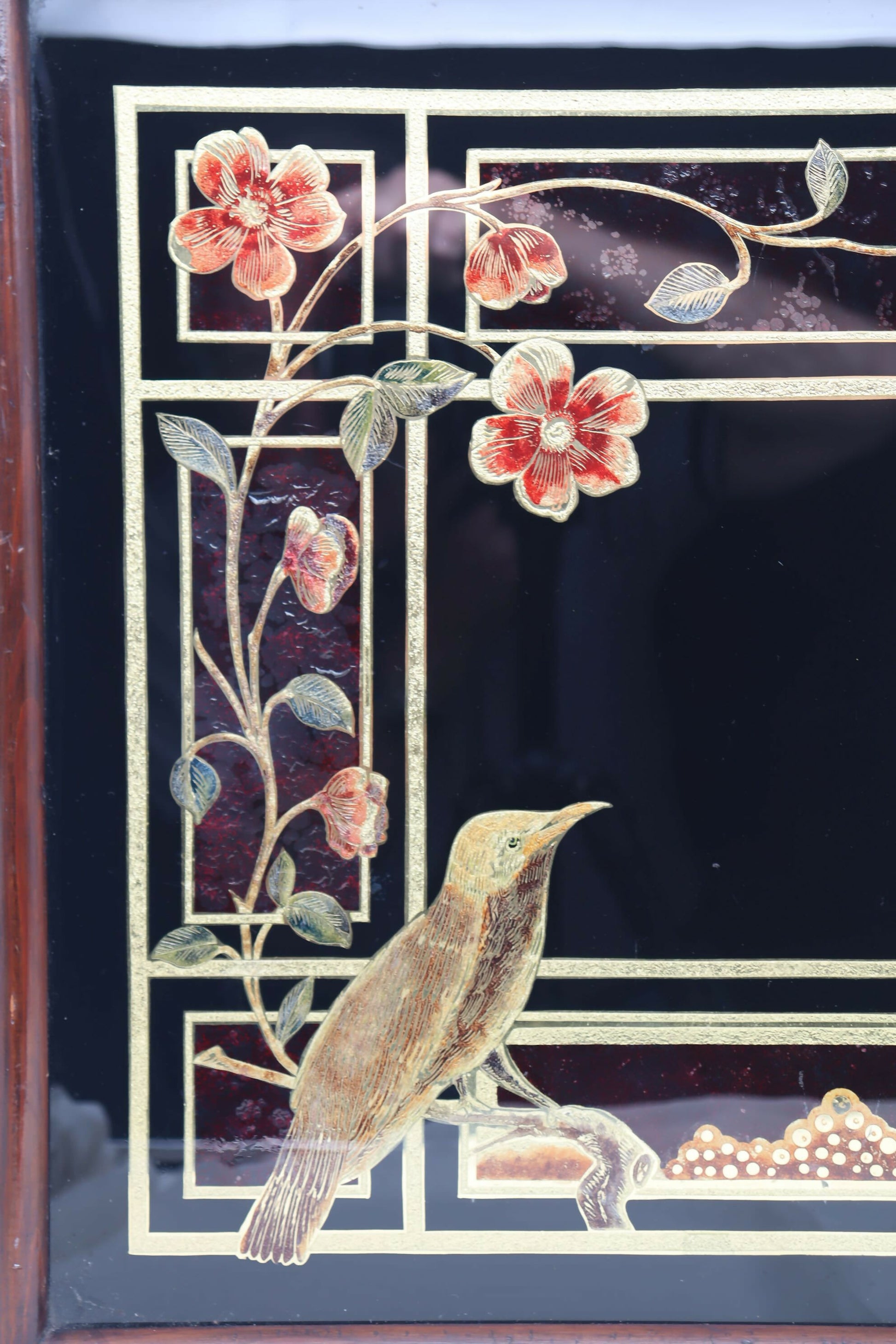 This large Victorian reverse painted glass tray is decorated with a scene of birds, flowers and a butterfly all above a gilded grid on a black ground. The glass has been etched and engraved on the back, then painted and gilded and mounted in a stained pine frame. This gives you a clean surface and ensures that the decoration cannot be damaged with usage. The brass handles are replacements as the originals had been removed and the tray hung on a wall as a decoration. The initials in the bottom right are DGI. It is 625 mm (24.75 inches) long, including the handles, 460 mm (18.25 inches) wide and stands 32 mm (1.25 inches) to the top of the frame. There are a couple of areas where the black ground has slightly lifted from the back of the glass, but overall, it is in very good condition. It would date from around 1880.