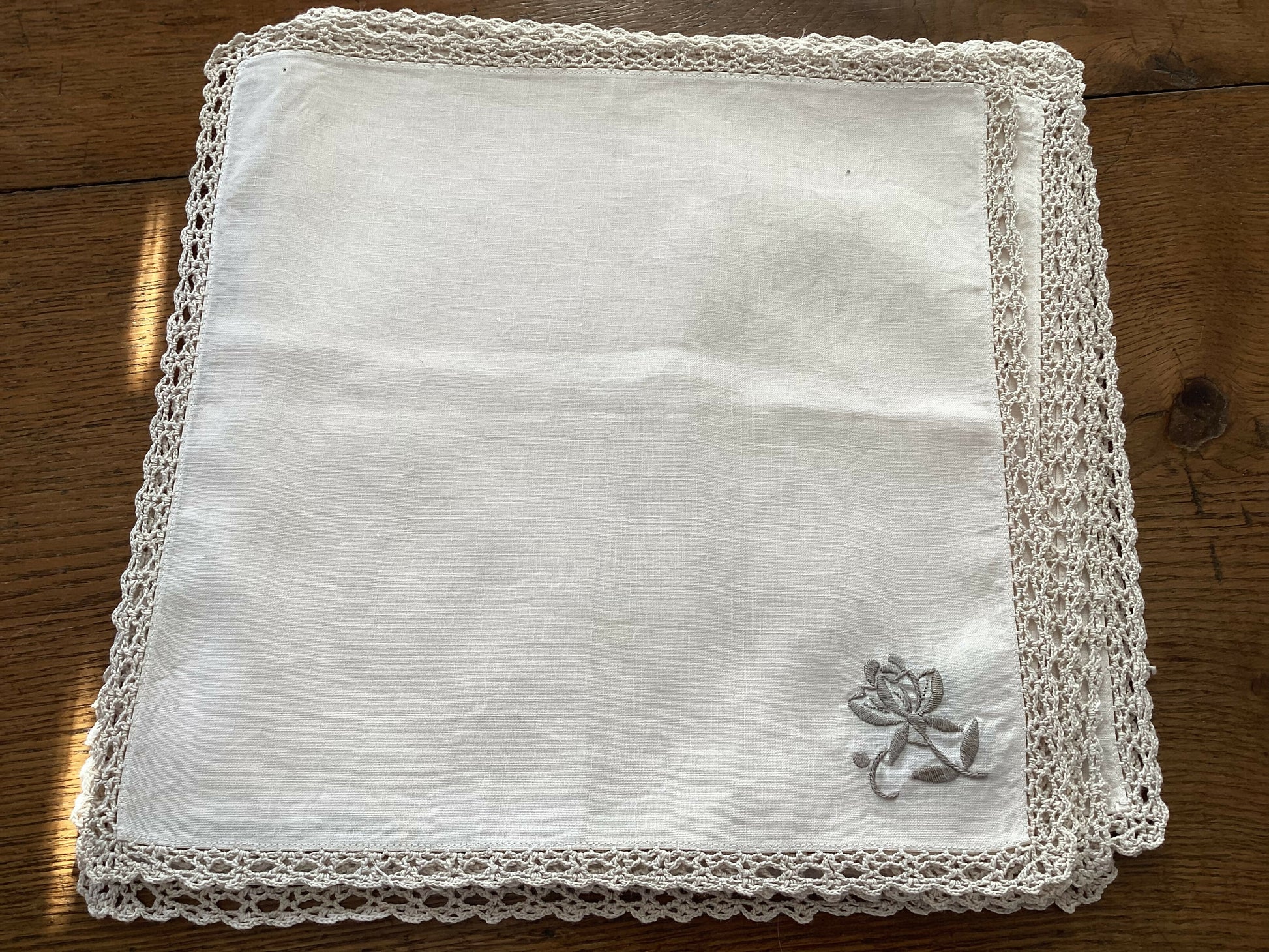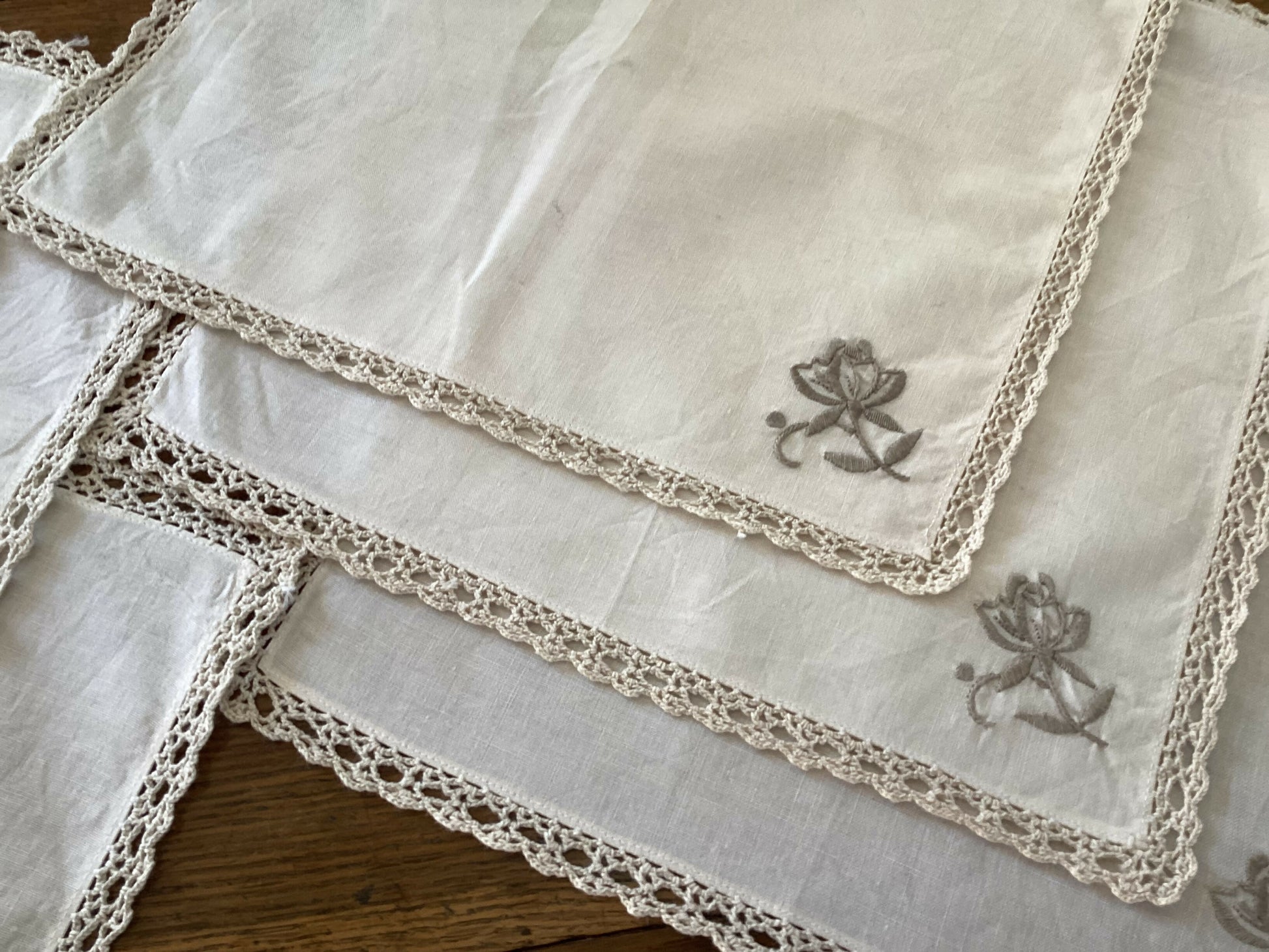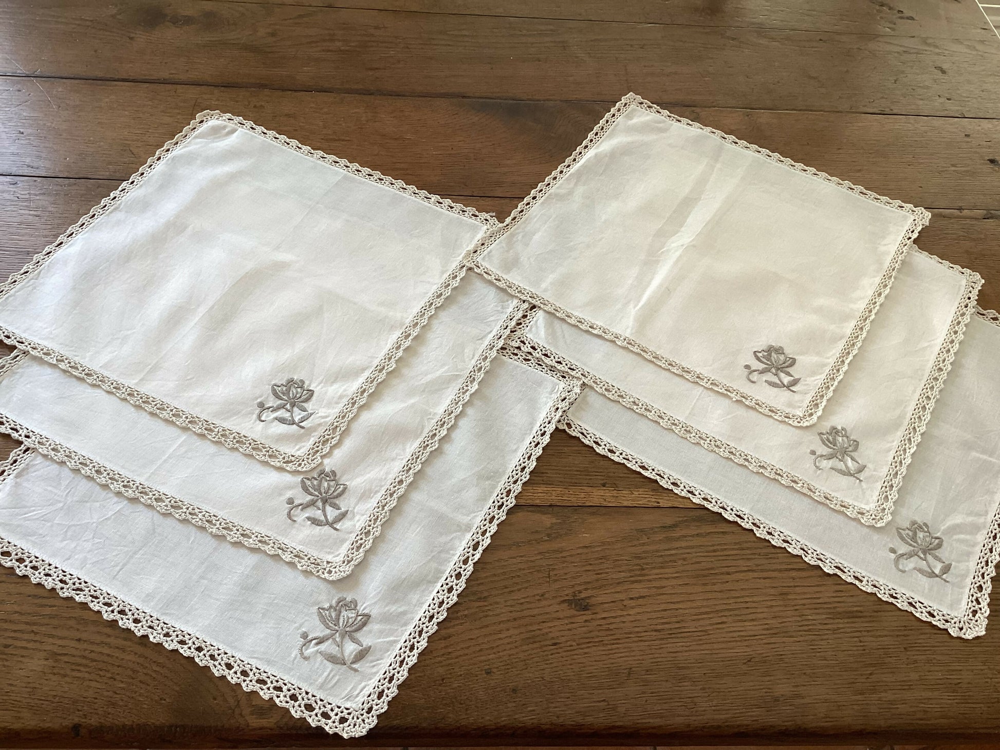 Set of six vintage ecru napkins with flower detail and crochet edges, great vintage condition, no stains. Price is for set of 6.
