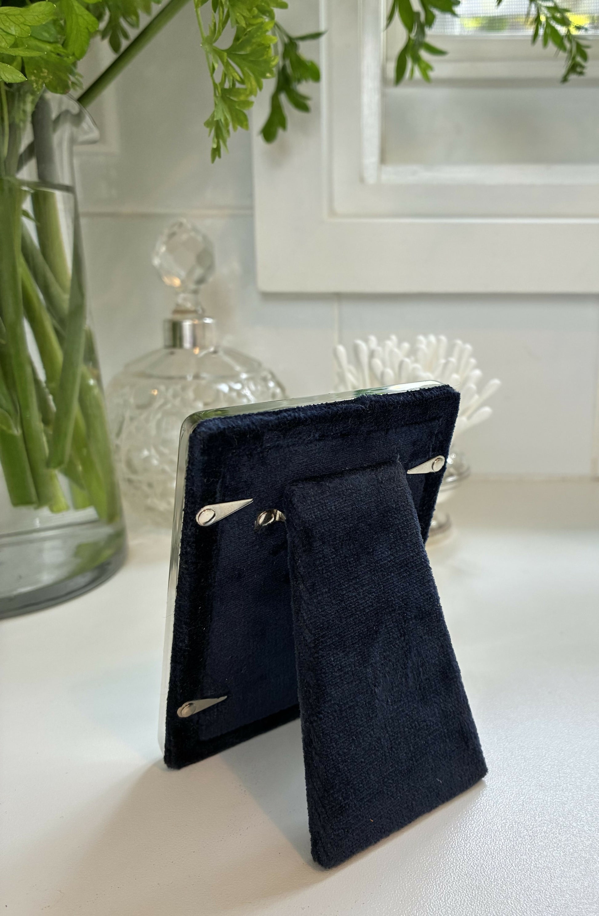 This beautiful silver plated frame by Whitehill, with it’s fine beaded border and blue velvet backing is in “as new” condition. I can see no marks or blemishes. It measures 10cm x 7.5cm.